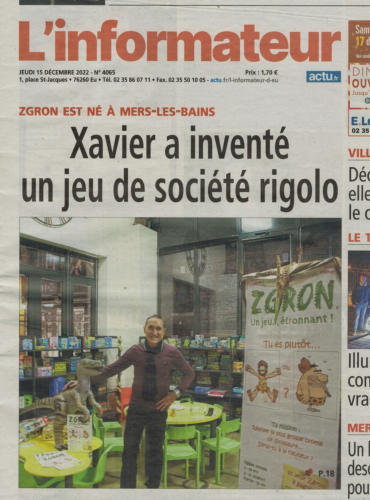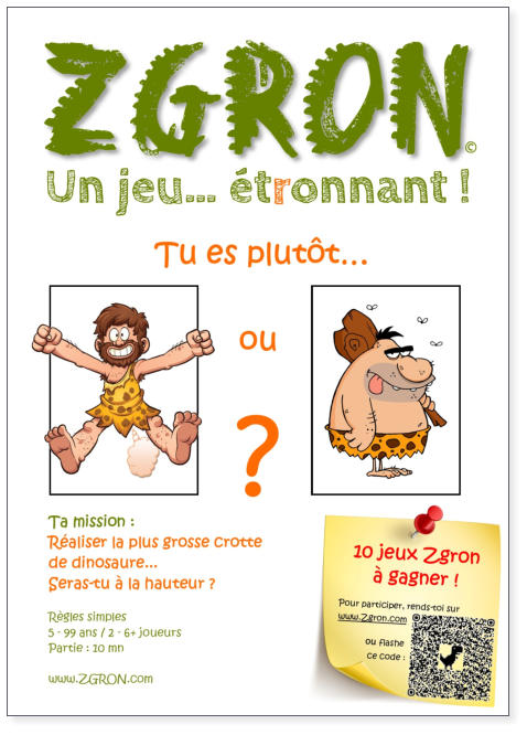 Réaliser le plus gros étron — la plus grosse crotte, quoi ! — de dinosaure, dans le plus grand nombre possible de catégories, jusqu'au Séismosaure (qui a vraiment existé) ! Les règles s'apprennent en quelques minutes. ZGRONse joue de 2 à 6 joueurs (voire plus), de 5 à 99 ans, lors de parties endiablées de 10 mn.